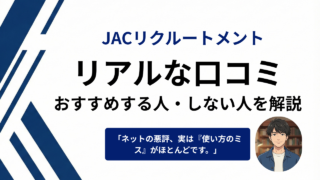 他社比較・使い分け JACリクルートメントの評判・口コミ|現役人事が40代へおすすめする人・しない人を解説 JACリクルートメントは40代・50代の「最後の砦」?現役人事の私が、ネットの悪い口コミを徹底検証。断られる理由や、企業側から見た「書類通過率が高い」裏事情まで、忖度なしで暴露します。年収ダウンを避けたいハイクラス層は必見の裏戦略です。 2026.03.04 JACリクルートメント他社比較・使い分け