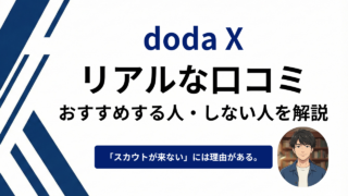 dodax doda Xの評判・口コミ|現役人事が40代へおすすめする人・しない人を解説 『doda Xって本当に良いスカウト来る?』と悩む40代へ。現役人事の私が、ネットの評判や「スカウトが来ない」と言われる裏事情を本音で暴露!ビズリーチとの違いや、絶対におすすめしない人の特徴まで、忙しい40代がハイクラス転職で失敗しない活用術を徹底解説します。 2026.03.15 dodax