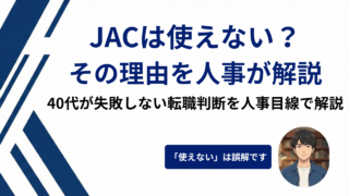 他社比較・使い分け JACリクルートメントは使えない?難易度が高すぎる理由を人事が解説 「JACリクルートメントは難易度が高すぎて使えない」と悩む40代へ。紹介されないのには、企業側のシビアな裏事情があります。現役人事がJACの厳しい基準の理由と、あえて厳しいJACに挑戦して「自分の市場価値」を測る、したたかなエージェント活用戦略を本音で解説します。 2026.04.12 JACリクルートメント他社比較・使い分け