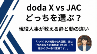 他社比較・使い分け doda XとJACどっち?現役人事が教える「静」と「動」の決定的違い 「doda XとJAC、ハイクラス転職ならどっち?」そんな疑問に現役人事が答えます。マイペースな「静」のdoda Xと、プロと走る「動」のJAC。決定的な違いやメリットを徹底比較し、あなたに合う選び方から併用すべきかの最終結論まで本音で解説します。 2026.01.21 JACリクルートメントdodax他社比較・使い分け