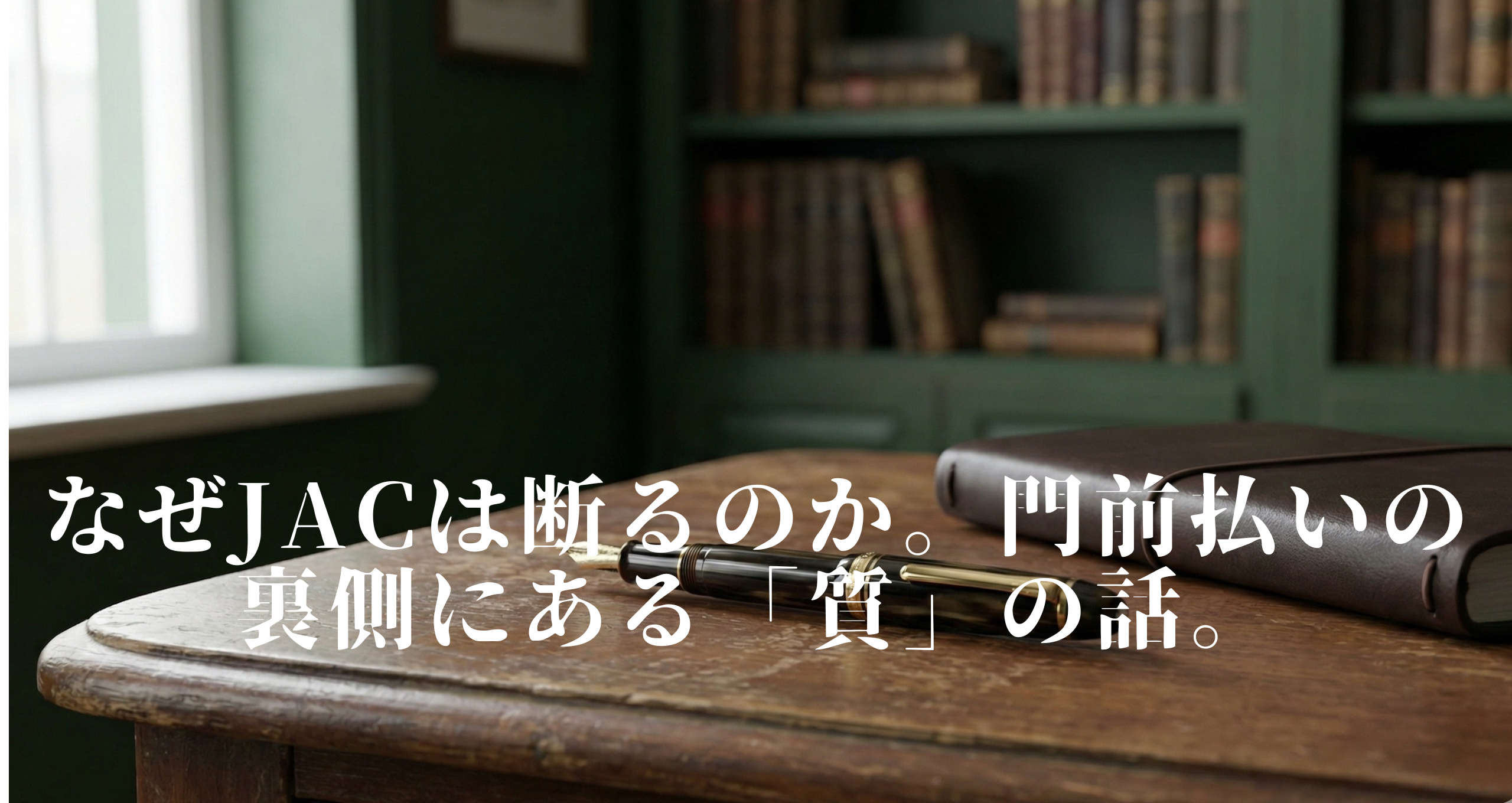 ですが、現役の人事として、このエージェントの「質の高さ」はよく知っています。 この記事では、あえて私が使わなかったJACリクルートメントについて、「なぜ利用を断られることがあるのか」、そして**「それでも登録してみる価値はあるのか」**を、人事の視点で静かに解説します。